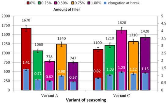 For all applied concentrations: 0.25% (1210 N); 0.50% (1620 N); 0.75% (1310 N); and 1% (1420 N), the values of standard force and elongation are higher than the results obtained in the control experiment, in which the standard force is 1100 N and the elongation is 0.82 mm. The values of elongation reveal a small scatter (Figure 6). The values of elongation of the adhesive joints specimens produced according to Variant C are higher than the results of both the control experiment and those obtained for the specimens produced by Method I in Variant A, where (Figure 6, Method I) elongation is smaller for each applied concentration than in the blank test (0%). The elongation of modified adhesive-produced adhesive joints subjected to seasoning is higher than the elongation of adhesive joints produced by the unmodified adhesive, for respective concentrations of: 0.25–20%; 0.50–37%; 0.75–27%; and 1–29%. The results of adhesive joint specimens produced with modified adhesives according to Variants A and C reveal the following differences for respective concentrations: 0.25–31%; 0.50–49%; 0.75–12.5%; and 1–50%. Moreover, it was observed that the elongation of adhesive joints produced using the unmodified adhesive and subjected to seasoning (0.82 mm) amounts to 58% of elongation of the adhesive joints that were not subjected to seasoning (1.41 mm).