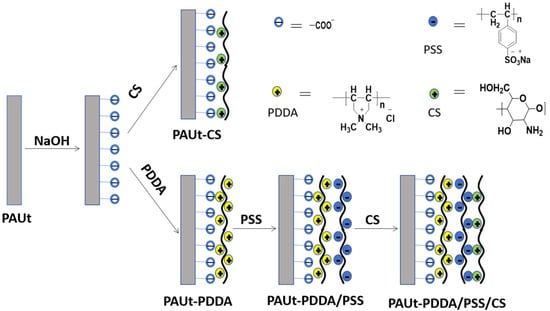 The procedure of hydrolyzation was adopted from the Ref. [35]. In brief, the nascent selective separation layer of PAUt membrane was firstly hydrolyzed in NaOH solution (pH = 7–12) for a certain period (i.e., 20 min). Then, DI water was applied to flush the surface until the pH of washing water become neutral. There are two loops to further modify the PAUt membrane (Figure 1). In the first loop, the top surface of the PAUt membrane was directly coated with 0.1–0.5 wt% CS for 20 min. The resultant membrane was labeled as PAUt-CS. In the second loop, the top surface of the PAUt membrane was firstly coated with 0.2 wt% positively charged PDDA for 20 min, after washing with DI water for 5 min, the membrane was then coated with the 0.2 wt% negatively charged PSS for another 20 min. Finally, the membrane was coated with 0.1–0.5 wt% CS for 20 min after DI water rinsing the surface. The resultant membrane was labeled as PAUt-PDDA/PSS/CS. After coating with the polyelectrolytes, 0.2 wt% GA solution was applied to crosslink the polyelectrolytes and the crosslinking process was conducted under 60 °C for 30 min [36].