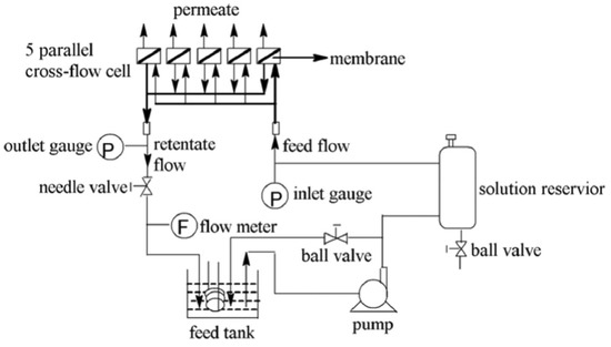 Reverse osmosis membrane performances in terms of water flux and salt rejection were performed and evaluated [34]. A cross-flow reverse osmosis testing setup with five parallel cells was used for the current study (Figure 2). Membrane coupons with a diameter of 40 mm with an effective area of 12 cm2 were thoroughly washed by DI water prior to loading to the cell. Firstly, the membrane was compacted with DI water under 1.55 MPa for at least 2 h. After flux was maintained steady for at least 30 min, a 2000 ppm NaCl feed solution was applied with a constant cross flow velocity of 8.0 liter per minute (LPM). The water flux Jv was determined by the gravimetric method. The salt rejection R was determined via Equation (1). The conductivity meter (DDS-307, Cany instruments Co. Ltd., Shanghai, China) measured the conductivity of permeate Cp and conductivity of feed solution Cf, respectively.