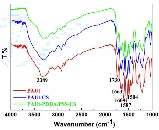 ATR-FTIR spectrum of PAUt, PAUt-CS, and PAUt-PDDA/PSS/CS membrane, respectively.