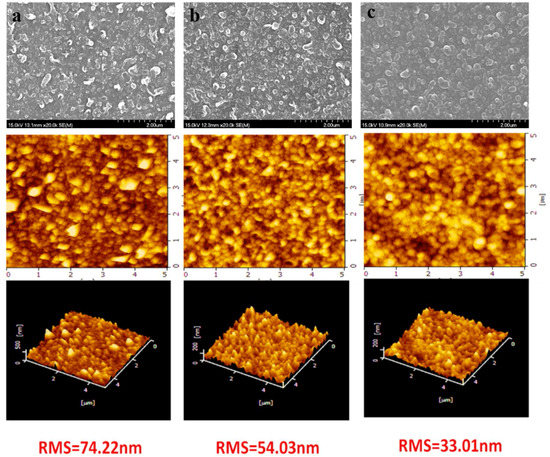 SEM and AFM images of virgin and modified PAUt membranes are shown in Figure 5. In the first raw, PAUt membrane surface is characterized by the rough nodular structure, (Figure 5a), similar to the typical polymiade ridges and valley structures described in the literature [38]. After coating with CS (Figure 5b), a quite similar structure was resulted as compared with the virgin membrane. It indicates a rather thin CS layer coating has formed, which could be carried away by physical rinsing (the detail discussion will be presented in Section 3.3). Interestingly, distinct ridge and valley patterns almost disappeared for PAUt/PDDA/PSS/CS (Figure 5c). Thus, it can be inferred that the electrostatically assembled polyelectrolyte layers contributed to cover the rough surface and resulted in a relatively smooth surface. This observation can be confirmed by comparing the coated and virgin membranes in AFM images, where the root mean square (RMS) value of the PAUT/PDDA/PSS/CS is the lowest (i.e., 33.01 nm compared with the 74.22 nm for PAUt and 54.03 nm for PAUt/CS). The smoother surface will benefit better antifouling property, being a disc, which will be discussed in the later section.