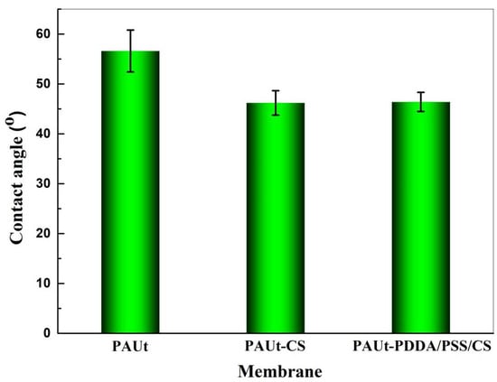 The water contact angle was used to evaluate the hydrophilicity of TFC membranes (Figure 6). In general, the membrane is hydrophilic at the contact angle θ less than 90°, while the membrane is hydrophobic at the contact angle θ more than 90°. The smaller the contact angle is, the higher the membrane hydrophilicity is. As shown in Figure 6, the water contact angles of PAUt-CS (46.2°) and PAUt-PDDA/PSS/CS (46.4°) are nearly the same, but they are obviously less than that of PAUt membrane (56.6°). In other words, coated-CS layer endows the two modified membranes with the same hydrophilicity, while results in much better hydrophilicity than the virgin membrane. This is probably because CS is a hydrophilic matter due to the existence of hydroxyl groups, which contributes greatly to the improvement of hydrophilicity of the membrane surface. It is well known that a high hydrophilic surface is an important characteristic in terms of good membrane permeability and anti-fouling property, which will be discussed in detail later.