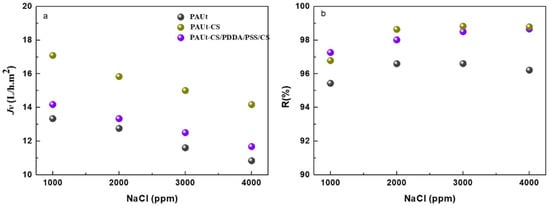 The water flux and salt rejection of PAUt, PAUt-CS and PAUt-PDDA/PSS/CS were shown in Figure 8. Various concentrations of NaCl solution were utilized in the current study. To get the stabilized water flux and salt rejection results, all the membranes were compacted under 1.55 MPa for at least two hours, and at least three independent membranes were tested and obtained the average results. Overall, the membrane water flux followed the sequence of PAUt < PAUt-CS < PAUt-PDDA/PSS/CS at all NaCl concentrations (Figure 8a). It should be noted, after NaOH hydrolyzation, the water flux exhibited around 16 liters per minute (LPM) at 2000 ppm NaCl solution. It was clearly observed that PAUt-CS had a similar water flux as compared with the NaOH hydrolyzed PAUt membranes, while showed a higher water flux as compared with the nascent PAUt membranes. After further coating with PDDA/PSS and caped with CS, the water flux significantly reduced due to more resistance from the two additional polyelectrolytes layers. However, the water flux of PAUt-PDDS/PSS/CS was still higher than the nascent PAUt membranes. With the increase of the feed solution concentration, water flux of all types of membranes reduced because of the decrease of effective hydraulic pressure. In addition to this, concentration polarization can add to the decrease of water flux at higher salt solution concentration [41]. The salt rejection against NaCl for different types of membranes was shown in Figure 8b. Generally, the salt rejection followed the order of PAUt-CS ≈ PAUt-PDDA/PSS/CS > PAUt. There are several possible reasons to lead the phenomenon: (1) the significantly lower water flux of PAUt leads to the lower rejection [42]; (2) the additional coating layer contributes to the increasing salt rejection of the two modified membranes as compare with the nascent PAUt membranes; (3) the additional coating layer of PDDA/PSS slightly changed the density of the active layer of PAUt-PDDA/PSS/CS membrane as compared with that of PAUt-CS, which lead to the similar salt rejection of PAUt-CS and PAUt-PDDA/PSS/CS.