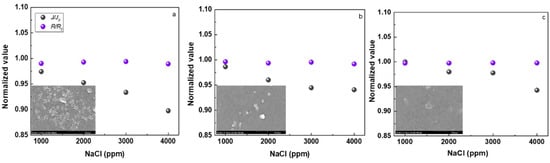 The reverse osmosis membrane performance of all fouled membranes was evaluated under the same conditions as in Section 4.4. For all the membranes, the pre-filtered real lake water was used as feed solution and the operation was continued for seven days. The normalized water flux and salt rejection with different salt solution concentration were presented in Figure 9. The normalized value of 1 indicates no change of water flux or rejection happened after membrane soaking in the real lake water, where J/J0 indicates the ratio of water flux after fouling and before fouling, respectively. Similarly, R/R0 indicates the ratio of rejection after fouling and before fouling, respectively.