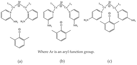 The effects of isomeric L2, L3, and L4 ligands on the rate of polymerization are very different, which could be speculated on in view of steric effects [19]. Figure 4 shows the accessibility of a phenolate anion when L2, L3, and L4, which are ortho-, meta-, and para-positioned, respectively, are coordinated to a Cu ion. The steric hindrance which occurs during the formation of the Cu–amine ligand complex is a possible reason for the result. A possible active catalytic species in PPE synthesis is a coordination compound formed from two copper ions, amine ligands, and an aryloxide anion. When a Cu–amine ligand complex is formed, the steric hindrance from the ligands would make it difficult for the phenolate anion to approach the Cu ion, and the reactivity would decrease as a result. In the case of L2, when the phenolate anion is about to coordinate with the Cu catalyst, it is subjected to steric hindrance from the amino group at the ortho position of L2. Therefore, it appears that in all of the experiments using L2 polymerization does not occur. Since L4 is the most basic ligand and free from steric hindrance in the formation of the coordination compound, it shows the highest reaction rate. L3 has a weaker basicity than L1, but leads to a larger polymerization rate. This observation could not be rationalized by steric hindrance since L3 would experience similar or less steric hindrance than L1 during a complex formation process. In fact, the rate of polymerization is greatly influenced by the type of solvent in addition to basicity and steric hindrance [25]. These two ligands differ in polarity: L1 is a polar aprotic compound and L3 is a polar protic compound. This difference seems to have affected the polymerization rate.