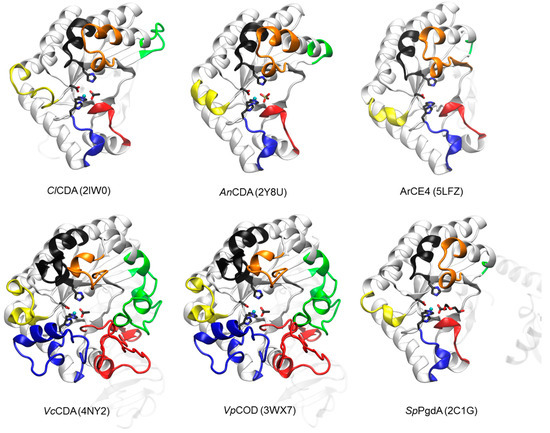 3D structures of CDAs determined by X-ray crystallography. Loops 1 to 6 colored as in Figure 3. The peptidoglycan deacetylase SpPgdA is also included for comparison (see text). In parenthesis, PDB accession codes.