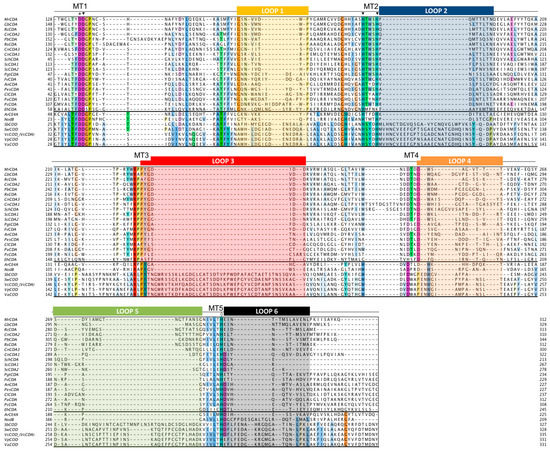 Multiple sequence alignment of the CDA enzymes listed in Table 1. Loops are highlighted with colored boxes according to [69]. Conserved catalytic motifs are labelled MT1-5. The ‘His-His-Asp’ metal binding triad (▼), catalytic base (*), and catalytic acid (◊) are labelled.