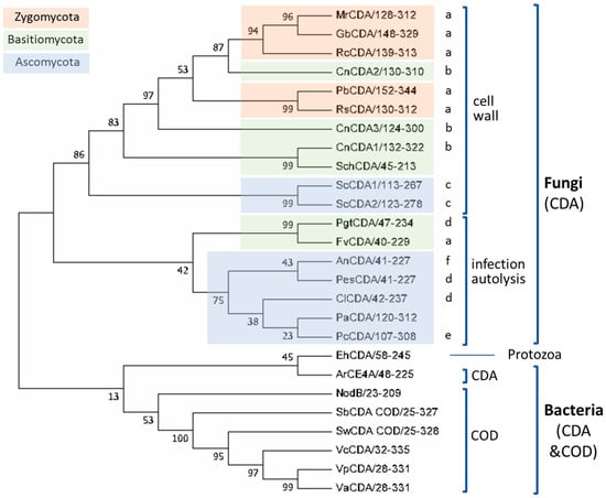 Phylogenetic analysis of CDAs from the multiple sequence alignment presented in Figure 3. A bootstrap analysis with 500 replicates was carried out on the trees inferred from the neighbor joining method. The consensus tree is shown with bootstrap values at each node of the tree. Biological functions: cell wall biosynthesis: (a) cell wall, (b) vegetative growth, (c) sporulation; host infection, (d) defense, (e) interaction/infection, (f) autolysis (see text).