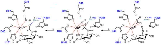 Metal-assisted general acid/base mechanism proposed for CE4 deacetylases. Scheme based on the 3D structure of the enzyme·substrate complex VcCDAD39S·DP2 [61]. D39 is the general base and His295 is the general acid.