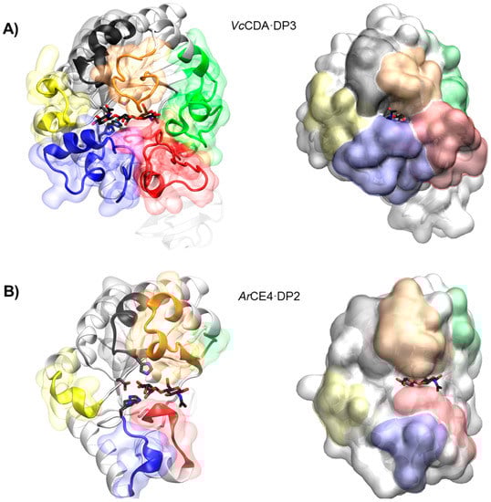 The series of crystal structures of the Vibrio cholerae chitin oligosaccharide deacetylase (VcCDA or VcCOD) reported in 2014 [69] were the first 3D structures of a CE4 enzyme in complex with substrates. These data provided a first insight into structure-function relationships for this family of enzymes and highlighted the role of the loops that shape the binding site cleft in substrate binding. Recently by the end of 2017, the 3D structure of an Arthrobacter sp. CDA (ArCE4) in complex with substrate has also been reported [76]. Albeit sharing the same molecular function, both enzymes represent two different scenarios regarding the binding site topology and, hence, substrate specificity. VcCDA has a rather closed binding cleft and is highly specific for monodeacetylation of COS, whereas ArCE4 has a more open binding cleft and is able to fully deacetylate their COS substrates (Figure 6). A comparative structural analysis of both enzyme structures has been recently reviewed [142].