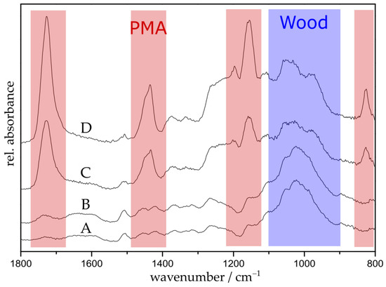 The grafting of poly(methyl acrylate) was performed by placing the initiator-functionalized particles in a one-pot mixture of methyl acrylate (MA), anisole, Copper(II) bromide (CuBr2), pentamethyldiethylenetriamine (PMDETA), and ascorbic acid (AsAc). The suspension was purged with argon for 5 min. The polymerization was conducted at 60 °C with polymerization times ranging between 45 min and 9.5 h. The choice of anisole as solvent is crucial because on the one hand, it is a good solvent for the catalyst system and on the other hand, it is a poor solvent for AsAc. Since AsAc is a very strong reducing agent, poor solubility limits its reduction potential, preventing high radical concentrations and, therefore, loss of control over the polymerization [42]. Additionally, the ligand PMDETA was used in a tenfold excess in order to ensure the formation of the intended metal ligand complex [43,44]. After the polymerization, the samples were washed with an excess of tetrahydrofuran. The grafted samples were characterized by FTIR spectroscopy, scanning electron microscopy (SEM), thermogravimetric analysis (TGA), and water contact angle (WCA) measurements. Figure 1 shows the recorded FTIR spectra of untreated wood (A), initiator-immobilized wood (B), and PMA-grafted wood with polymerization times of 2 h (C) and 5 h (D). For reason of simplicity, spectra of other polymerization times are exclusively shown in the supporting materials (Figure S1). It can be clearly seen that polymerization results in the emergence of four distinct peaks at 1725, 1435, 1153, and 826 cm−1 (shown in red) attributed to PMA [45]. The intensity of the PMA peaks increases whereas the intensity of the wood peaks at 1100–900 cm−1 (shown in blue) decreases with progressing polymerization time [46].