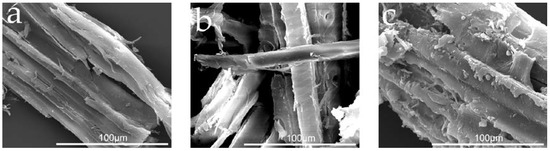 SEM studies were employed to capture the surface topography of unmodified wood (Figure 2a), initiator-functionalized wood (Figure 2b), and PMA-grafted wood particles after 5 h (Figure 2c). Before modification, wood exhibits a fibrous structure with a smooth surface. Immobilization of the ATRP initiator resulted in no significant topographical change. After graft polymerization, however, the surface was rough and irregular due to a clearly visible polymer layer [34].
