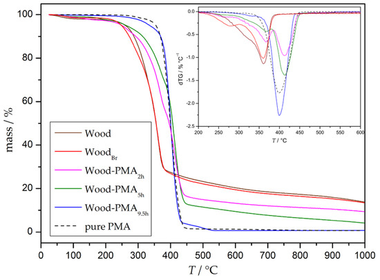 Thermogravimetric analysis was conducted to study the thermal behavior of the grafted samples. The thermogram (TG) and the respective derivation (DTG) of unmodified and modified wood as well as of pure PMA are depicted in Figure 3, and the corresponding decomposition temperatures (Ton: onset degradation temperature, Tmax: temperature at the maximal degradation state) and mass losses (ML) are summarized in Table 1. Untreated wood starts to degrade sharply at 200 °C with a maximum at 360 °C and a total mass loss of 69% in this stage. Afterwards, at 450 °C, wood decomposes further at a much slower steady rate. This result is in good agreement with decomposition measurements of the three main wood components—cellulose, hemicellulose, and lignin. The degradation of cellulose and hemicellulose takes place at a high rate at 200–380 °C and 250–380 °C, whereas lignin slowly decomposes at 180–900 °C [47]. Initiator immobilization (WoodBr) results in a decrease of the onset temperature to 160 °C and a similar Tmax. Accordingly, it can be concluded that initiator immobilization on the wood surface decreases thermal stability, due to two reasons: first, esterification of cellulose damages its crystallinity; and second, hydrogen bromide may be formed, which catalyzes the decomposition of wood [31,33]. Pure PMA starts to decompose at 220 °C with a maximum decomposition rate at 400 °C and a total mass loss of 98%. Grafted samples (Wood-PMAxh) show a two-step degradation profile; the steps fluently merge into each other and can be assigned to a wood decomposition stage (Tmax approx. 360 °C) and a PMA decomposition stage (Tmax approx. 400 °C). In general, surface-initiated graft polymerization of PMA results in an increased thermal stability indicated by a decreased mass loss below 200 °C. A longer polymerization time leads to an increased Ton in the wood stage and, therefore, a shift to pure PMA. A closer look at the mass losses at both stages shows that the ML decreases in the wood stage with progressing polymerization time (Table 1, blue arrow), but increases in the PMA stage (Table 1, red arrow).