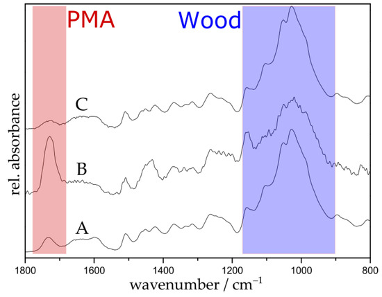 ATR-FTIR spectroscopy was utilized to confirm the complete removal of the surface-tethered polymer with DTT. Figure 5 shows the spectra of the disulfide initiator-immobilized wood (A), PMA-grafted wood containing disulfide linker (B), and DTT-cleaved wood substrate (C). After cleavage, the polymer signal at 1725 cm−1 (red region) is substantially decreased and the resulting spectrum looks very similar to the spectrum of untreated wood (see Figure 1a); this confirms the successful cleavage of the polymer.