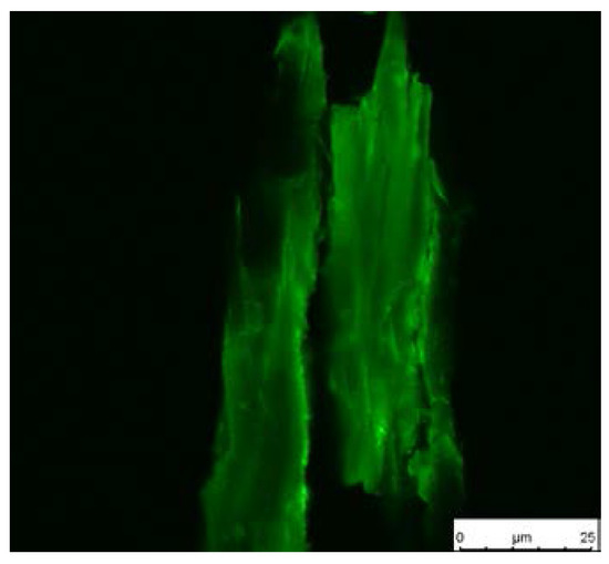 Dried wood flour containing thiol groups was immersed in a solution of 32 μg·mL−1 fluorescence dye (Abberior LIVE 510) in PBS (phosphate-buffered saline, pH 7) and shaken overnight in the dark. Afterwards, the flour was washed four times with PBS, centrifuged, and put on a microscope glass slide (Thermo Fisher, Waltham, MA, USA). Fluorescence images were taken with a microscope Leica DMi8 (Leica Microsystems GmbH, Wetzlar, Germany) equipped with a 63× oil immersion objective. The excitation was performed with an argon krypton laser, which was set to a gain of 500 mV and an intensity of 2%. The excitation wavelength was set to 488 nm and the detection range set to 500–570 nm.
