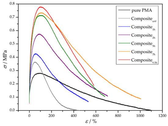 PMA-grafted wood flour was incorporated in a PMA matrix and its influence on the mechanical properties of the composites was investigated using uniaxial tensile testing. The matrix polymer PMA was synthesized via reversible addition-fragmentation (RAFT) polymerization. Dogbone specimens were prepared using solvent casting. Tensile testing was performed at room temperature with a constant strain of 0.25 mm·s−1. A constant weight percent of wood flour with a varying amount of grafted polymer was incorporated in the matrix and the influence on the Young’s modulus E, the yield strength σy, and the toughness UT was recorded. Samples of pure PMA and composites of unfunctionalized wood flour in PMA served as references to evaluate the reinforcing character of the grafted wood flour. Figure 7 shows typical stress-strain plots, chosen from a data set of three measurements per sample. The corresponding mechanical characteristics are summarized in Table 5.
