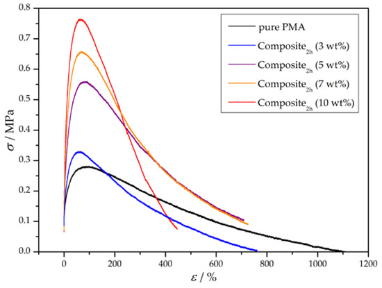 Representative stress-strain curves of pure PMA and wood-reinforced thermoplastics with a constant amount of grafted polymer and varying weight percentages.