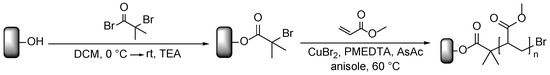 - Matyjaszewski, K.; Hongchen, D.; Jakubowski, W.; Pietrasik, J.; Kusumo, A. Grafting from surfaces for “everyone”: ARGET ATRP in the presence of air. Langmuir 2007, 23, 4528–4531. [Google Scholar] [CrossRef] [PubMed]