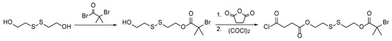 Usually, a sacrificial initiator is deployed to spectroscopically follow the progress of the polymerization and to obtain information about the control over the polymerization [12]. Free polymer formed from the sacrificial initiator can be analyzed by size-exclusion chromatography (SEC), which provides estimations of the molecular weight and dispersity of the polymer grafts [48,49]. Alternatively, polymer grafts can be cleaved off and analyzed directly, but this often requires harsh conditions and leads to degradation of the surface [50,51]. In this study, no sacrificial initiator was utilized, because the formation of free polymer was undesired. Instead, an ATRP initiator bearing a disulfide group was immobilized on the surface, allowing the detachment of the polymer grafts under mild conditions [52,53]. Subsequently, the detached polymer was analyzed by SEC to receive information about the molar mass and dispersity. The synthesis of the disulfide initiator is outlined in Scheme 2.