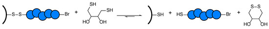 The resulting disulfide-containing particles were treated with a solution of 1,4-Dithiothreitol (DTT) and TEA in tetrahydrofuran (THF) at room temperature for several days to cleave off the grafted polymer. DTT is a reducing agent bearing two thiol groups which react selectively with the disulfide bond of the surface-tethered initiator [39,54]. In the reaction, the disulfide group of the substrate is reduced, leading to a surface-tethered thiol moiety and the release of the polymer into the solution with a thiol end group, as can be seen in Scheme 3.