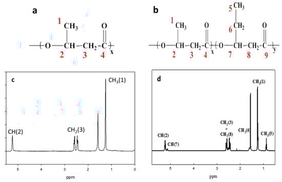 (a) PHB monomer structure; (b) PHBV monomer structure; (c) 1H NMR spectrum of PHB copolymer in CDCl3 solution; (d) 1H NMR spectrum of PHBV copolymer in CDCl3 solution.