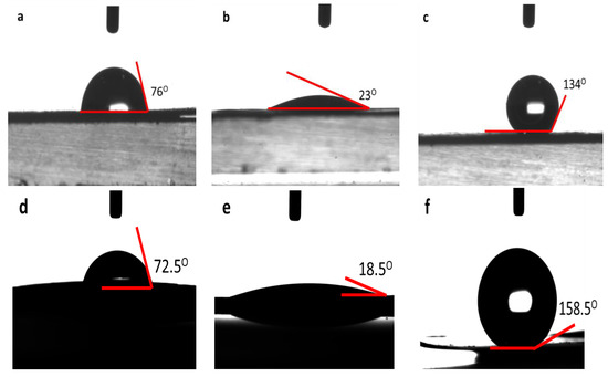 Water contact angle of (a) untreated (normal), (b) CH4/O2 plasma-treated (hydrophilic), (c) C2H2F4 plasma-treated (hydrophobic) PHB films and (d) untreated (normal), (e) CH4/O2 plasma-treated (hydrophilic), (f) C2H2F4 plasma-treated (hydrophobic) PHBV films.