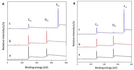 XPS spectral analysis on the surface of (A) PHB and (B) PHBV films. a, b, and c represent untreated, CH4/O2, and C2H2F4 plasma-treated, respectively.