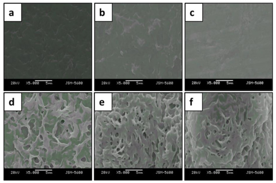SEM of (a–c) PHB and (d–f) PHBV films. (a,d): normal; (b,e): hydrophilic; (c,f): hydrophobic.