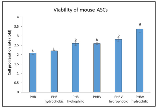 Cell proliferation rate of in vitro cultured mouse ASCs on PHB, PHB hydrophobic, PHB hydrophilic, PHBV, PHBV hydrophobic, and PHBV hydrophilic. Values are mean ± SD of triplicate readings. Different letter(s) represent a significant different (p < 0.05) using Tukey’s test.