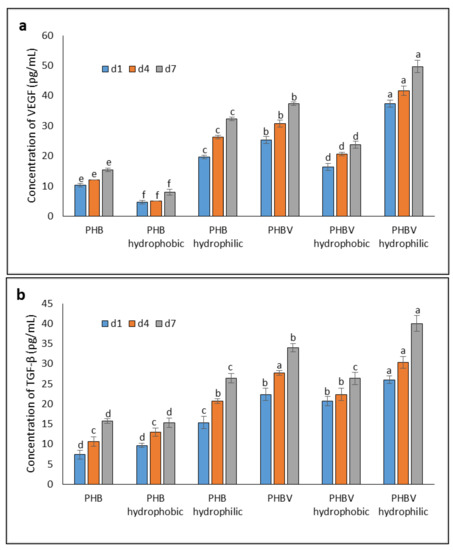 As depicted in Figure 7a, both the hydrophobic PHB and PHBV films showed the lowest concentrations of VEGF (i.e., 8.00 ± 1.00 and 23.67 ± 1.15 pg/mL, respectively) compared to their respective groups (i.e., untreated and hydrophobic PHB and PHBV), and the increase in VEGF concentration from days 1 to 7 was prominently delayed. In contrast, both the hydrophilic PHB and PHBV films recorded the highest concentrations of VEGF at 32.33 ± 0.58 and 49.67 ± 2.08 pg/mL, respectively, on day 7. Similarly, the TGF-β concentrations secreted from the PHB and PHBV films followed a similar trend as those of VEGF. The TGF-β concentrations on the hydrophilic PHB and PHBV films were highest at 26.33 ± 1.15 and 40.00 ± 2.00 pg/mL, respectively, on day 7 compared to their respective groups (i.e., untreated and hydrophobic PHB and PHBV) (Figure 7b). Overall, the hydrophilic PHBV film resulted in the highest concentrations of VEGF and TGF-β secreted by mouse ASCs among the others.