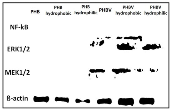 Figure 8 shows the results of a western blot analysis on the protein expression level for the plasma-treated and untreated PHB and PHBV films. We chose proteins involved in wound repair and cell proliferation to verity our hyopthesis. Our results reveal that the PHBV with and without plasma surface modifications showed enhanced levels of protein expression compared to those of PHB films, except nuclear factor-kappaB (NF-kB) protein expression. This finding suggests that PHBV exhibits better cell proliferation and wound repair functions compared to those of PHB, and its performance was greatly improved after the plasma surface modification. Thus, PHBV may serve as an attractive biomaterial for various industrial and medical applications [21,28].