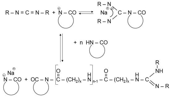As direct activator in the CL polymerization usually N-acetyl-ε-caprolactam was used along with NaCL or CLMgBr initiators [1,12]. Such systems were also used in model studies [13]. Other widely used direct or indirect activators are represented by N-carbamoyllactams. Bruggolen® C20 (C20) for example contains hexamethylene-1,6-dicarbamoylcaprolactam as active species. The active substance in Addonyl® ACTIVATE is a CL-blocked isocyanate. N-carbamoyllactam precursor polyisocyanates are offered by Rhein-Chemie (Lanxess) under the trade names Addonyl® 8101 and Addonyl® TT. Polycarbodiimide-based activators are also commercially available (Addonyl® P). The growth center from carbodiimide and alkali lactamate has a guanidine structure—see Figure 2. Because the guanidine anion is stabilized by resonance, it undergoes fast proton transfer followed by rapid chain propagation—see scheme in Figure 2 [14]. This activator was the essential part of the initiator/activator package, developed by EMS Chemie (Domat, Switzerland), for the anionic LL polymerization (see later).