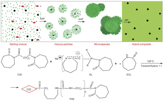 Next we summarize the achievements with polyamide nanocomposites produced in in situ AROP (Table 2). It is noteworthy that most of the related works synthesized the nanocomposites in casting and other melting techniques (rotational and extrusion molding). An important exception is given by the microcapsule technique shown in Figure 7.