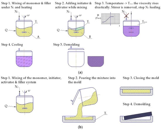 As underlined above the rate of polymerization and crystallization strongly depends on the temperature (below or above Tm, isothermal or adiabatic conditions), as well as on type/amount of the initiator/activator. A large body of works addressed this issue aiming to derive proper kinetic models. The related experimental work was often supported by powerful statistical analysis [31]. Russo et al. [32] compared different kinetics models and claimed that that of Kamal and Sourour [33] fits best for the activated anionic polymerization of CL. To adapt this, an autocatalytic model (which is widely used to describe the curing of various thermosets [34]) was proposed by Teuwen et al. [35]. Moreover, the cited author recommended using the isothermal crystallization model for the crystallization of the PA-6 formed during the anionic polymerization of CL. The prediction of polymerization/crystallization in the AROP of lactams is essential for process modelling. The polymerization kinetic approach of Malkin [36] was implemented by Nagy et al. [37] in a fluid dynamics code to estimate the flow of the polymerizing CL during mold filling.