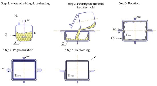 To support the reactive rotational molding of in situ polymerized PA-6 the authors summarized the chemorheological results (isothermally heated) in TTT diagrams. Considering the fact that also for rotational molding the ideal viscosity should be less than 1 Pa·s, the processing window (time available at a given temperature to reach this threshold) could be well defined [46]. In this study features of classical (PA-6 powder/flake) and reactive rotomolding (anionic polymerization of CL) were compared. Table 1 clearly shows the benefits of reactive rotational molding over traditional ones [46].