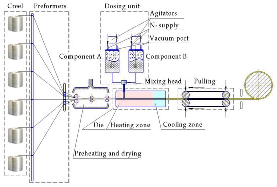- Luisier, A.; Bourban, P.-E.; Manson, J.-A.E. Reaction injection pultrusion of PA12 composites: Process and modelling. Composites 2003, 34, 583–595. [Google Scholar] [CrossRef]