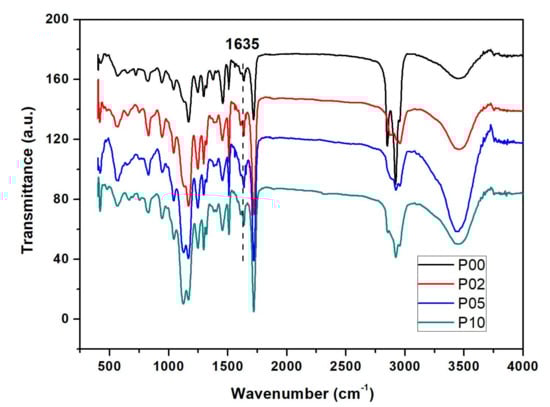 The FTIR spectra of composite resins with different POSS contents after curing are shown in Figure 3. The band at 1635 cm−1 was attributed to the characteristic absorption peaks of the C=C bond. When the curing happened, the methacrylate double bonds partly converted and the resins polymerized []. The intensity of C=C absorption at 1635 cm−1 became evidently weaker.