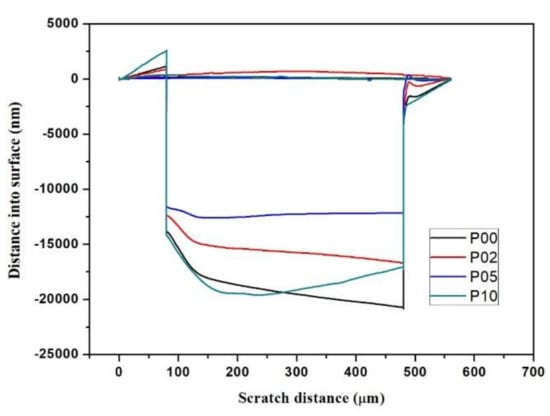 The testing results of the hardness, elastic modulus, and the average scratch depth are listed in Table 2. The influence of composite resins with different POSS contents on the scratch profiles is shown in Figure 5. A total length of about 560 μm for each test was generated (including 80-μm pre-scanning and post-scanning at the two ends of real scratch path). The scratch region was from 80 to 480 μm in the scratch distance, in which the profile was essentially affected by the load value, hardness, and elasticity, revealing the scratch resistance property of a sample.