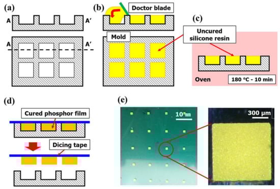 Overview of the phosphor film fabrication process (a) design and fabrication of elastic mold; (b) phosphor slurry dosing; (c) thermal curing; (d) phosphor film transferred to dicing tape; (e) fabricated phosphor film.