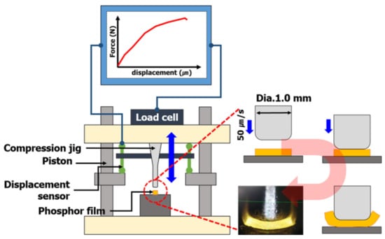 Specimens for measuring tensile strength to predict the tensile strength of phosphor films using three types of phosphor slurries were fabricated. The specimens for measuring tensile strength, based on the specifications of ASTM D412, injected 5.6 g of 3 phosphor slurries in which the tensile specimen shape was engraved in a metal mold (STD61, PTFE coated). Using a tensile tester (KNR Systems, Yongin, Korea), each specimen was pulled at 23 °C and a tensile speed of 50 mm/min to compare the stress results according to the deformed length. In particular, the tensile strain and ultimate tensile stress up to the point of breaking in the stress–strain curve for each of the three resins were compared with the tensile strength (tensile strength at 5% elongation) when pulled by 5%. The compressive fracture strength of the phosphor film was measured using a micro-compression device (KNR Systems, Yongin, Korea) with a metal jig having a diameter of 1 mm. The compressive load (N) per jig transfer distance was measured when the top surface of the phosphor film was pressed with 0.05 mm/s speed to a breaking point of 0.3 mm (Figure 3). The solder ball shear test (JESD22-B117) was introduced to investigate the adhesion power between the elastic mold and the cured phosphor film. Phosphor slurry was applied at a size of 2.0 mm × 2.0 mm × 0.3 mm on top of a metal specimen (STD61) as shown in Figure 4 and then cured by applying the curing conditions determined in Section 2.2. After applying a shear load (speed of 200 μm/s and height of 50 μm) at the side of the phosphor film using the bonding tester (Dage 4000, Nordson Dage, Buckinghamshire, UK), the maximum shear load immediately before peeling was measured to verify its adhesion power.