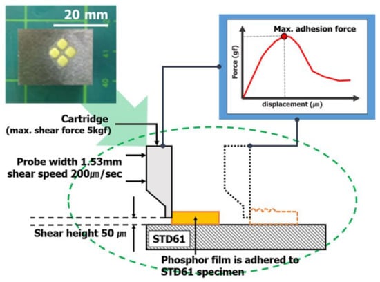 Principle of shear testing for measuring the adhesion force between the phosphor film and STD61.