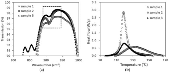 (a) Comparison of absorption peaks of the three resins: to be drawn by narrowing to 800–1000 cm−1 and (b) DSC heat flow result among the 3 resins.