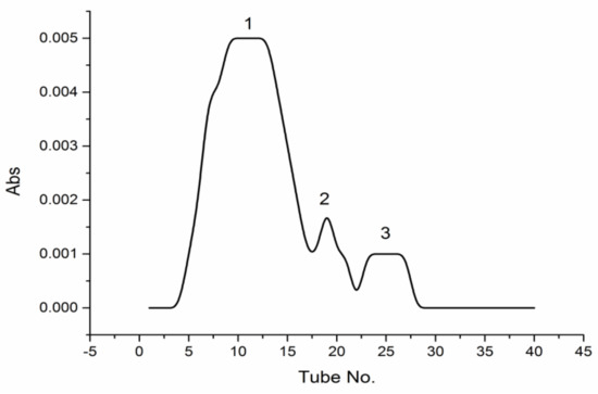 Labeled PPM60-Tyr (10 mg) was dissolved in distilled water and purified through gel filtration chromatography using Sephacryl S-400HR (GE Healthcare, Uppsala, Sweden), and eluent collected every 5 min, with optical density measured at 280 nm. The results showed that PPM60-Tyr had three absorption peaks. The concentration of the first peak was highest between 4–17 tubes (Figure 1).