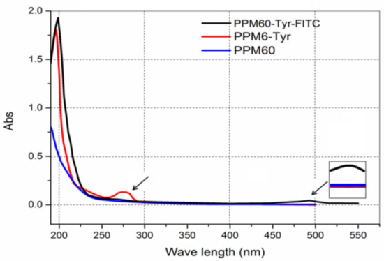 Product labeled with FITC was named PPM60-Tyr-FITC. By UV scanning, there was a new absorption peak at 490 nm (Figure 2), indicating that FITC was bound to the PPM60.