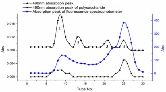The freeze-dried PPM60-Tyr-FITC was dissolved with distilled water and purified with Sephacryl S-400HR. OD value was measured at 490 nm to test the FITC. The concentration of polysaccharide was determined by phenol-sulfuric acid method [24] at 490 nm. Fluorescence absorption was measured by fluorospectrophotometer. Four peaks were obtained and named peak 1, peak 2, peak 3 and peak 4.