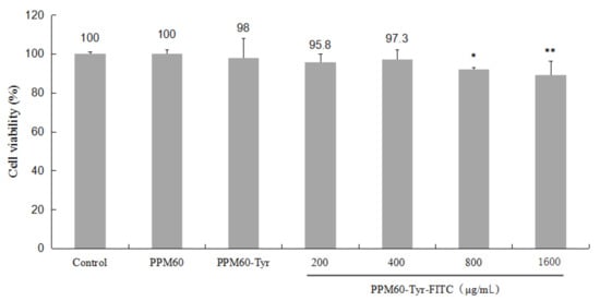 The influences of PPM60, PPM60-Tyr, PPM60-Tyr-FITC on the activity of RAW264.7 macrophages. The control group, PPM60, and PPM60-Tyr group were set at 200 μg/mL, PPM60-Tyr-FITC group at 200, 400, 800, 1600 μg/mL, with each concentration composed of 8 replicates. ** p < 0.01 vs. Control, * p < 0.05 vs. Control.