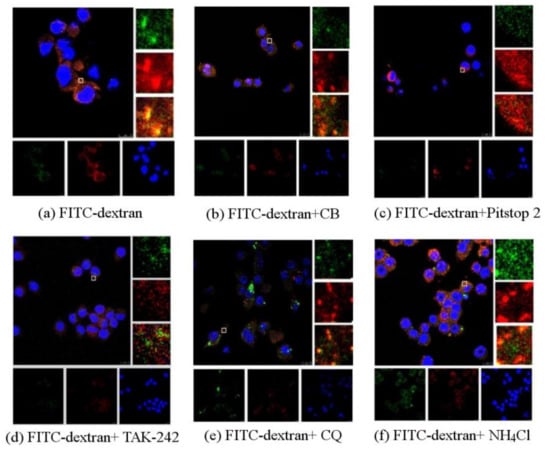 The CLSM results showed the co-localization of FITC-dextran and TLR4, which appeared brightly yellow (Figure 6a) because of co-localization between FITC-dextran marked with green fluorescence and TLR4 marked with red fluorescence, that indicated that dextran interacted with TLR4. The fluorescence of yellow in co-localization declined after treating with TAK-242 (Figure 6d), which indicated that TLR4 was indeed the receptor for polysaccharides. The yellow fluorescence was also significantly attenuated by the addition of the inhibitor Pitstop 2 (Figure 6c), indicating that clathrin-mediated endocytosis was involved in the process, as also stated before. The co-localization did not change much after adding CB compared with the control group (Figure 6b), which meant there was little FITC-dextran component entering into cells through phagocytosis, which needs the contraction of actin microfilaments. We did not see any obvious differences after adding CQ and NH4Cl, which influences the degradation of components of intracellular lysosomes by regulating proton pumps (Figure 6e,f), suggesting that the inhibition of endosomal acidification did not directly accelerate the disappearance of co-localization between FITC-dextran and Cy3-tagged TLR4.
