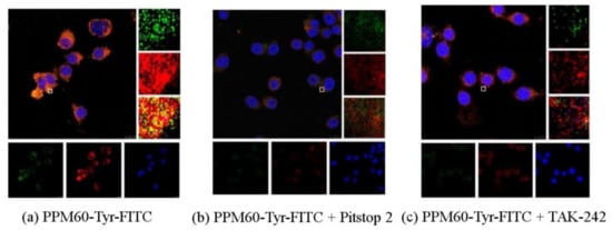Observation of the influences of PPM60-Tyr-FITC on RAW264.7 macrophages by CLSM (scale bar = 10 μm). (a) Co-localization of PPM60-Tyr-FITC and receptor was observed without inhibitor; (b) Pitstop 2 group had no co-localization; (c) TAK-242 group had no co-localization.