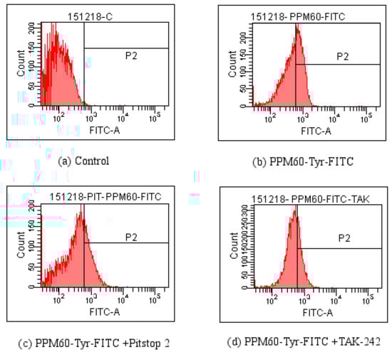 Detection influences of Pitstop 2 and TAK-242 on the entrance of PPM60-Tyr-FITC into RAW264.7 macrophages by FCM. (a) Control; (b) PPM60-Tyr-FITC; (c) PPM60-Tyr-FITC + Pitstop 2; (d) PPM60-Tyr-FITC + TAK-242.
