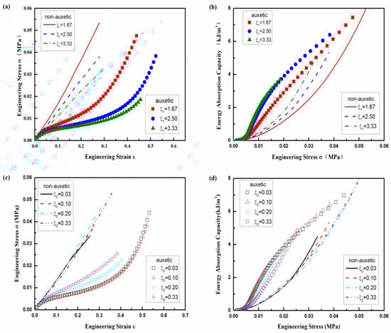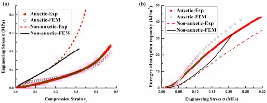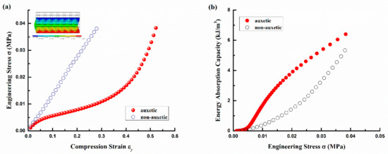 - All of the structural parameters and constituent material properties have different effects on the compression properties of auxtic and non-auxetic composites. For geometry effects, the decrease of ξ1 and increase of ξ2 can result in the increase of the compression stress and decrease of the EAC of the auxetic composite. For yarn property effects, the increase of E* can cause the increase of the compression stress and the decrease of the EAC of auxetic composite, but E′ has no effect on these properties. For PU foam effects, the increase of its initial shear modulus can result in the increase of the compression stress and the decrease of both EAC and auxetic behavior of auxetic composite.